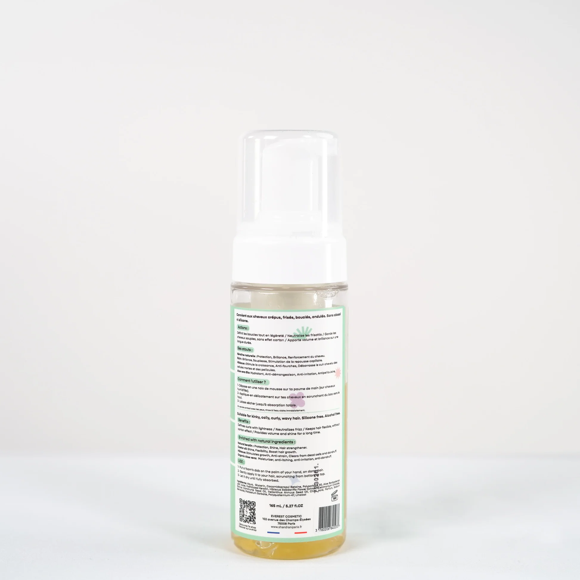 Enrichie en aloe vera bio, huile de ricin et fleur d’hibiscus, cette mousse offre un véritable soin coiffant, entre définition et nutrition.